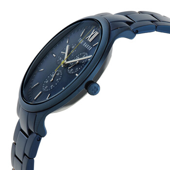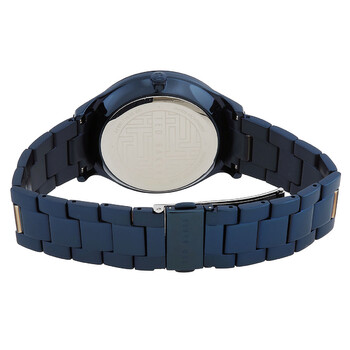 Blue stainless steel case and bracelet. Fixed blue stainless steel bezel. Blue dial with silver-tone hands and index-Roman numeral hour markers. Roman numeral marks the 12 o'clock position. Minute markers around the outer rim. Dial Type: Analog. Three sub-dials displaying: day, date and 24 hour. Quartz movement. Scratch resistant mineral crystal. Pull / push crown. Solid case back. Round case shape, case size: 40 mm. Deployment with push button release clasp. Water resistant at 50 meters / 165 feet. Functions: date, day, hour, minute, second, 24 hour. Manhatt Series. Casual watch style. Item Variations: BKPMHF0209I. Ted Baker Manhatt Multifunction Quartz Blue Dial Men's Watch BKPMHF020.