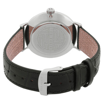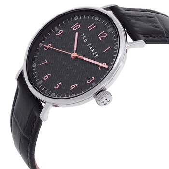 Silver-tone stainless steel case with a black leather strap. Fixed silver-tone stainless steel bezel. Black dial with rose gold-tone hands and Arabic numeral hour markers. Minute markers around the outer rim. Dial Type: Analog. Quartz movement. Scratch resistant mineral crystal. Pull / push crown. Solid case back. Round case shape, case size: 41 mm. Buckle clasp. Water resistant at 50 meters / 165 feet. Functions: hour, minute, second. Mimosaa Series. Casual watch style. Watch label: Japan Movt. Item Variations: BKPMMS1149I. Ted Baker Mimosaa Quartz Black Dial Men's Watch BKPMMS114.
