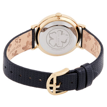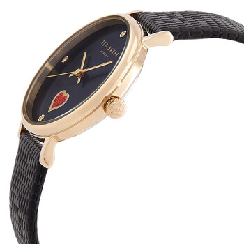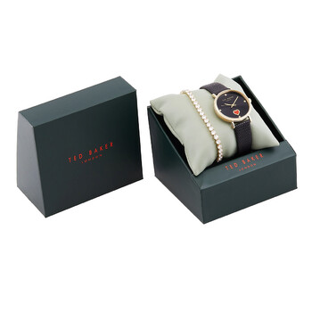 Gold-tone stainless steel case with a black leather strap. Fixed gold-tone stainless steel bezel. Black dial with gold-tone hands and crystal hour markers. Dial Type: Analog. Quartz movement. Scratch resistant mineral crystal. Pull / push crown. Solid case back. Round case shape, case size: 34 mm. Band width: 16 mm. Buckle clasp. Water resistant at 50 meters / 165 feet. Functions: hour, minute, second. Additional Info: includes matching goldtone stainless steel and crystal sliding bracelet. Phylipa Series. Casual watch style. Ted Baker Phylipa Quartz Crystal Black Dial Ladies Watch and Bracelet Set BKGFW22159I.