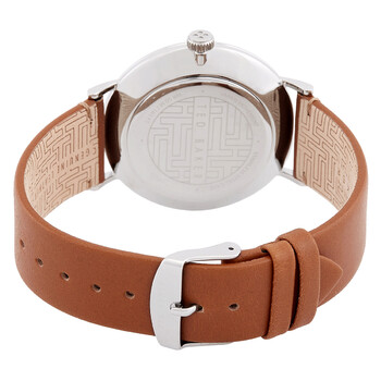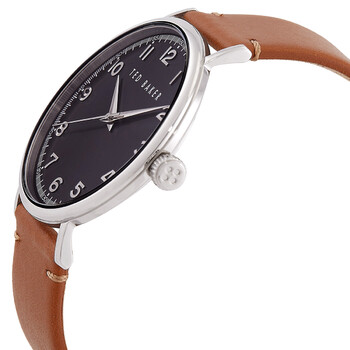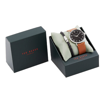 Silver-tone stainless steel case with a brown leather strap. Fixed silver-tone stainless steel bezel. Black dial with silver-tone hands and Arabic numeral hour markers. Minute markers around the outer rim. Dial Type: digital. Quartz movement. Scratch resistant mineral crystal. Pull / push crown. Solid case back. Round case shape, case size: 43 mm, case thickness: 10 mm. Buckle clasp. Water resistant at 50 meters / 165 feet. Functions: hour, minute, second. Phylipa Series. Sport watch style. Ted Baker Phylipa Quartz Digital Black Dial Men's Watch and Bracelet Set BKG0287009I.