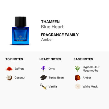 Blue Heart opens with intriguing top notes of saffron and coconut, creating an immediate sense of warmth and exoticism. As the fragrance unfolds, heart notes of orris, tonka bean, and vanilla emerge, adding a creamy and comforting depth. Finally, the base notes of cypriol oil or nagarmotha, amber, and white musk leave a lasting impression, enveloping you in an aura of elegance and sophistication.