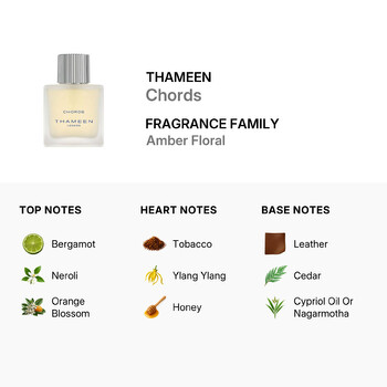 From the very first spritz, Chords opens with an uplifting blend of bergamot, neroli, and orange blossom. These bright and citrusy top notes create a fresh and inviting introduction that instantly draws you in. As the scent develops, the heart reveals a rich and unexpected mix of tobacco, ylang-ylang, and honey, offering a warm and slightly sweet twist that adds depth and sophistication.