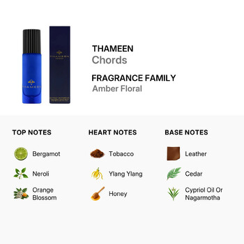 Chords opens with a bright and refreshing burst of bergamot, neroli, and orange blossom, creating a citrusy prelude that uplifts the senses. As the fragrance develops, warm heart notes of sweet honey, exotic ylang ylang, and rich tobacco emerge, adding depth and complexity. Finally, a smooth blend of leather, cedar, and earthy cypriol oil grounds the scent with a lasting, sophisticated finish.
