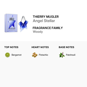 Belonging to the woody fragrance family, Angel Stellar opens with a sparkling top note of bergamot that instantly awakens the senses. As the scent unfolds, a creamy heart of pistachio adds a unique twist—warm, nutty, and irresistibly rich. Finally, the base note of patchouli grounds the fragrance with earthy sophistication, leaving a memorable trail wherever you go.