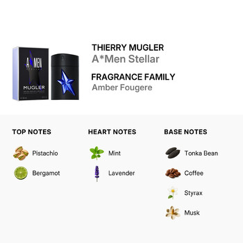 Belonging to the Amber Fougere fragrance family, A*Men Stellar opens with an intriguing blend of pistachio and fresh bergamot. These top notes awaken your senses with a unique combination of nuttiness and citrus sparkle, paving the way for a refreshingly cool heart of mint and soothing lavender. Together, these elements strike a perfect balance between bold and calming.