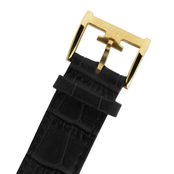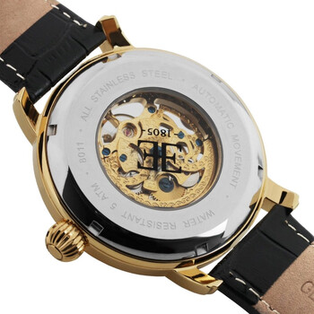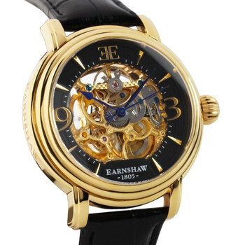 Gold ion-plated stainless steel case with a black leather strap. Fixed gold ion-plated bezel. Black (skeleton center) dial with blue hands and index hour markers. Arabic numerals appear at the 3 and 9 o'clock positions. Minute markers around the outer rim. Dial Type: Analog. Automatic movement. Scratch resistant mineral crystal. Pull / push crown. Transparent case back. Round case shape. Case size: 48 mm. Case thickness: 16 mm. Band width: 22 mm. Tang clasp. Water resistant at 50 meters / 165 feet. Functions: hour, minute, second. Longcase Series. Casual watch style. Thomas Earnshaw Longcase Automatic Black Dial Men's Watch ES-8011-03.