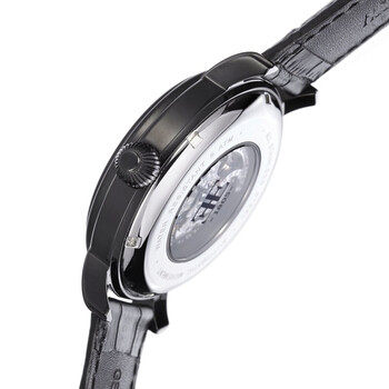 Black ion-plated stainless steel case with a black leather strap. Fixed black ion-plated bezel. Grey (skeleton) dial with purple hands and index hour markers. Arabic numerals appear at the 3 and 9 o'clock positions. Minute markers around an inner ring. Dial Type: Analog. Automatic movement. Scratch resistant mineral crystal. Transparent case back. Round case shape. Case size: 48 mm. Case thickness: 16 mm. Band width: 22 mm. Tang clasp. Water resistant at 50 meters / 165 feet. Functions: hour, minute, second. Longcase Series. Dress watch style. Thomas Earnshaw Longcase Automatic Grey Dial Men's Watch ES-8011-08.