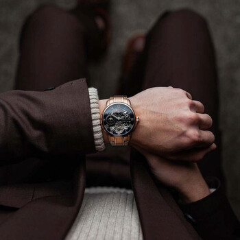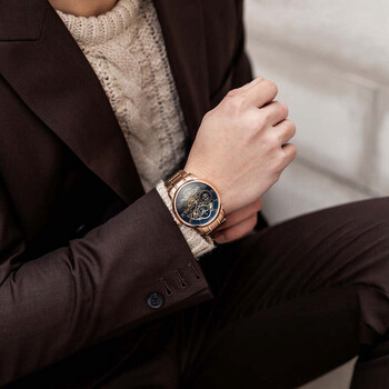 Drawing inspiration from the lines of Longitude, once the most crucial tool in navigating the seas, a large, classically formed case exhibits a complex yet precise piece of timekeeping mastery. Rose gold-tone stainless steel case and bracelet. Fixed rose gold-tone stainless steel bezel. Black dial with rose gold-tone hands and index hour markers. Dial Type: Analog. PTS - Z2033 automatic movement. Scratch resistant mineral crystal. Pull / push crown. Transparent case back. Round case shape, case size: 44 mm, case thickness: 14 mm. Band width: 22 mm, band length: 8 inches. Fold over clasp with a safety release. Water resistant at 50 meters / 165 feet. Functions: chronograph, hour, minute, second. Longitude Series. Casual watch style. Thomas Earnshaw Longitude Black Dial Men's Watch ES-8006-44.