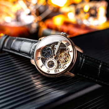 Drawing inspiration from the lines of Longitude, once the most crucial tool in navigating the seas, a large, classically formed case exhibits a complex yet precise piece of timekeeping mastery. Rose gold-tone stainless steel case with a black leather strap. Fixed rose gold-tone stainless steel bezel. Rose gold-tone dial with silver-tone hands and index hour markers. Dial Type: Analog. PTS - Z2033 automatic movement. Scratch resistant mineral crystal. Pull / push crown. Transparent case back. Round case shape, case size: 44 mm, case thickness: 14 mm. Band width: 22 mm, band length: 8 inches. Water resistant at 50 meters / 165 feet. Functions: chronograph, hour, minute, second. Longitude Series. Casual watch style. Thomas Earnshaw Longitude Rose Gold-tone Dial Men's Watch ES-8006-0E.