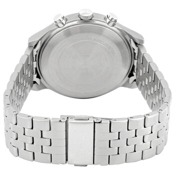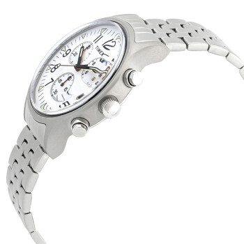 Stainless steel case with a stainless steel bracelet. Fixed stainless steel bezel. White dial with luminous black hands and Arabic numeral hour markers. Minute markers around the outer rim. Dial Type: Analog. Luminescent hands and markers. Date display at the 4 o'clock position. Chronograph - three sub-dials displaying: 60 second, 30 minute and 1/10th of a second. Quartz movement. Scratch resistant mineral crystal. Pull / push crown. Solid case back. Round case shape. Case size: 42 mm. Case thickness: 13 mm. Band width: 20 mm. Deployment clasp with a push button release. Water resistant at 30 meters / 100 feet. Functions: chronograph, date, hour, minute, second, indiglo night-light with night-mode. Casual watch style. Timex Chronograph Quartz White Dial Men's Watch TW2R68900.