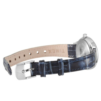 Silver-tone brass case with a blue (croco-embossed) leather strap. Fixed silver-tone brass bezel. Silver dial with silver-tone hands and index hour markers. Arabic numerals appear at the 3, 6, 9 and 12 o'clock positions. Minute markers around an inner ring. Dial Type: Analog. Quartz movement. Scratch resistant mineral crystal. Pull / push crown. Solid case back. Round case shape. Case size: 26 mm. Case thickness: 8 mm. Band width: 12 mm. Tang clasp. Water resistant at 50 meters / 165 feet. Functions: hour, minute, second. Classics Series. Luxury watch style. Timex Classic Quartz Silver Dial Ladies Watch TW2R86000.