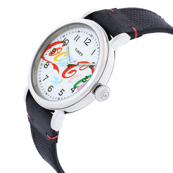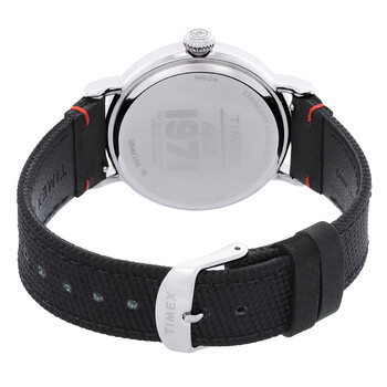 Silver-tone stainless steel case with a black fabric strap. Fixed silver-tone stainless steel bezel. White dial with silver-tone hands and Arabic numeral hour markers. Minute markers around the outer rim. Dial Type: Analog. Quartz movement. Scratch resistant mineral crystal. Pull / push crown. Solid case back. Round case shape, case size: 40 mm. Buckle clasp. Water resistant at 50 meters / 165 feet. Functions: hour, minute, second. Coca Cola Unity Series. Casual watch style. Timex Coca Cola Unity Quartz White Dial Men's Watch TW2V26000.