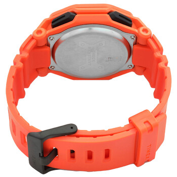 Orange resin case with a orange plastic strap. Fixed orange bezel. Black dial. Dial Type: digital. Quartz movement. Scratch resistant mineral crystal. Solid case back. Tonneau case shape, case size: 40 mm, case thickness: 14 mm. Tang clasp. Water resistant at 100 meters / 330 feet. Functions: date, day, hour, minute, second,stop watch, dual time, alarm, indiglo light, timer. Command Encounter Series. Sport watch style. Timex Command Encounter Alarm Quartz Digital Black Dial Men's Watch TW2V60000.
