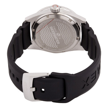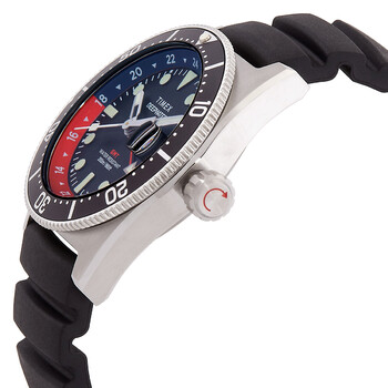 Silver-tone stainless steel case with a black rubber strap. Uni-directional rotating black stainless steel bezel. Black dial with silver-tone hands and index hour markers. Minute markers around the outer rim. Dial Type: Analog. Luminescent hands and markers. Date display at the 3 o'clock position. Quartz movement. Scratch resistant sapphire crystal. Screw down crown. Solid case back. Round case shape, case size: 41 mm, case thickness: 13 mm. Band width: 22 mm. Buckle clasp. Water resistant at 200 meters / 660 feet. Functions: GMT, second time zone, date, hour, minute, second. Deepwater Reef Series. Dive watch style. Item Variations: TW2W75000VQ. Timex Deepwater Reef Quartz Black Dial Men's Watch TW2W75000.