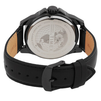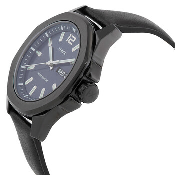 Black brass case with a black leather strap. Fixed black brass bezel. Blue dial with silver-tone hands and index-Arabic numeral hour markers. Minute markers around the outer rim. Dial Type: Analog. Luminescent hands and markers. Day of the week and date display at the 3 o'clock position. Quartz movement. Scratch resistant mineral crystal. Pull / push crown. Solid case back. Round case shape, case size: 44 mm. Band width: 22 mm. Buckle clasp. Water resistant at 50 meters / 165 feet. Functions: date, day, hour, minute, second. Essex Avenue Series. Casual watch style. Timex Essex Avenue Quartz Blue Dial Men's Watch TW2V42900VQ.
