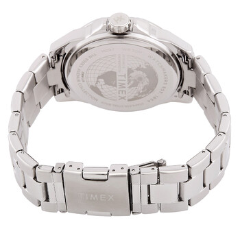 Silver-tone brass case with a silver-tone stainless steel bracelet. Fixed silver-tone brass bezel. Black dial with silver-tone hands and index-Arabic numeral hour markers. Dial Type: Analog. Three sub-dials displaying: date, day and 24 hour. Quartz movement. Scratch resistant mineral crystal. Pull / push crown. Solid case back. Round case shape, case size: 46 mm. Deployment with push button release clasp. Water resistant at 50 meters / 165 feet. Functions: date, day, hour, minute, second, 24 hour. Essex Series. Casual watch style. Item Variations: TW2W79900VQ. Timex Essex Multifunction Quartz Black Dial Men's Watch TW2W79900.