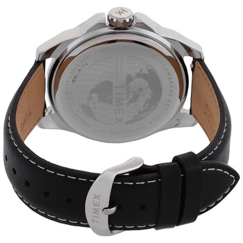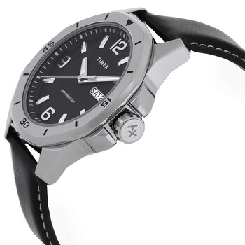 Silver-tone low lead brass case with a black leather strap. Fixed silver-tone low lead brass bezel. Black dial with silver-tone hands and index-Arabic numeral hour markers. Minute markers around the outer rim. Dial Type: Analog. Day of the week and date display at the 3 o'clock position. Quartz movement. Scratch resistant mineral crystal. Pull / push crown. Solid case back. Round case shape, case size: 46 mm. Buckle clasp. Water resistant at 50 meters / 165 feet. Functions: date, day, hour, minute, second. Essex Series. Casual watch style. Item Variations: TW2W79800VQ. Timex Essex Quartz Black Dial Men's Watch TW2W79800.