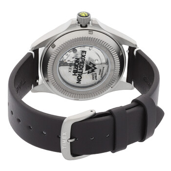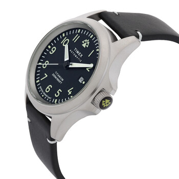 Titanium case with a black leather-ecco dritan strap. Fixed titanium bezel. Black dial with silver-tone hands and Arabic numeral hour markers. Minute markers around the outer rim. Dial Type: Analog. Date display at the 3 o'clock position. Automatic movement. Scratch resistant sapphire crystal. Screw down crown. Transparent case back. Round case shape, case size: 41 mm, case thickness: 12.5 mm. Band width: 20 mm. Buckle clasp. Water resistant at 200 meters / 660 feet. Functions: date, hour, minute, second. Expedition North Series. Item Variations: TW2V54000JR. Timex Expedition North Automatic Black Dial Men's Watch TW2V54000.