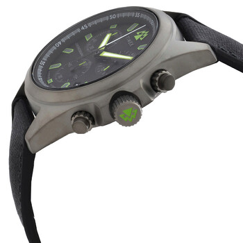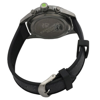 Titanium PVD stainless steel case with a black synthetic rubber strap. Fixed titanium PVD stainless steel bezel. Black dial with green hands and index hour markers. Minute markers around the outer rim. Dial Type: Analog. Luminescent hands and markers. Date display between 4 and 5 o'clock position. Chronograph - three sub-dials displaying: 60 second, 60 minute and 24 hour. Quartz movement. Scratch resistant sapphire crystal. Screw down crown. Solid case back. Round case shape, case size: 43 mm. Band width: 20 mm. Buckle clasp. Water resistant at 100 meters / 330 feet. Functions: chronograph, date, hour, minute, second. Expedition North Series. Sport watch style. Item Variations: TW2V96300JR. Timex Expedition North Field Chronograph Quartz Black Dial Men's Watch TW2V96300.