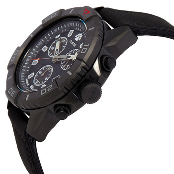 Black low lead brass case with a black leather strap. Uni-directional rotating black low lead brass bezel. Black dial with black hands and index hour markers. Minute markers around the outer rim. Dial Type: Analog. Date display at the 4 o'clock position. Chronograph - three sub-dials displaying: 60 second, 30 minute and 1/10th of a second. Quartz movement. Scratch resistant mineral crystal. Solid case back. Round case shape, case size: 42 mm. Buckle clasp. Water resistant at 100 meters / 330 feet. Functions: chronograph, date, hour, minute, second. Expedition North Series. Sport watch style. Item Variations: TW2W16000JR. Timex Expedition North Ridge Chronograph Quartz Black Dial Men's Watch TW2W16000.