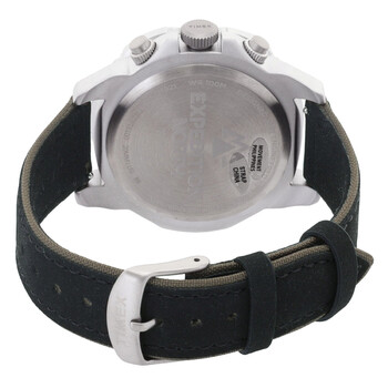 Silver-tone low lead brass case with a black leather strap. Uni-directional rotating silver-tone low lead brass bezel. Green dial with index hour markers. Minute markers around the outer rim. Dial Type: Analog. Date display at the 4 o'clock position. Chronograph - three sub-dials displaying: 60 second, 30 minute and 1/10th of a second. Quartz movement. Scratch resistant mineral crystal. Solid case back. Round case shape, case size: 42 mm. Buckle clasp. Water resistant at 100 meters / 330 feet. Functions: chronograph, date, hour, minute, second. Expedition North Series. Sport watch style. Item Variations: TW2W16100JR. Timex Expedition North Ridge Chronograph Quartz Green Dial Men's Watch TW2W16100.