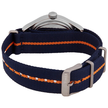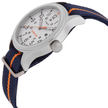Silver-tone low lead brass case with a blue fabric strap. Fixed silver-tone low lead brass bezel. White dial with Arabic numeral hour markers. Minute markers around the outer rim. Dial Type: Analog. Date display at the 3 o'clock position. Quartz movement. Scratch resistant mineral crystal. Pull / push crown. Solid case back. Round case shape, case size: 40 mm, case thickness: 11 mm. Band width: 20 mm. Buckle clasp. Water resistant at 50 meters / 165 feet. Functions: date, hour, minute, second, 24 hour. Expedition North Series. Military watch style. Timex Expedition North Sierra Quartz White Dial Men's Watch TW2V22800.