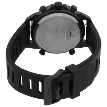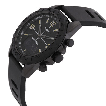 Black brass case with a black silicone strap. Uni-directional rotating black brass bezel. Black dial with luminous black hands and index hour markers. Arabic numerals appear at the 3, 9 and 12 o'clock positions. 24 hour markers. Minute markers around the outer rim. Dial Type: Analog-digital. Luminescent hands and markers. Digital sub-dial. Quartz movement. Mineral crystal. Pull / push crown. Solid case back. Round case shape. Case size: 41 mm. Case thickness: 11 mm. Strap width: 20 mm. Tang clasp. Water resistant at 50 meters / 165 feet. Functions: chronograph, date, hour, minute, second. Expedition Pioneer Series. Sport watch style. Timex Expedition Pioneer Chronograph Quartz Analog-Digital Black Dial Men's Watch TW4B17000.