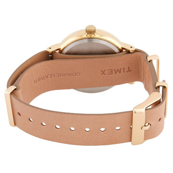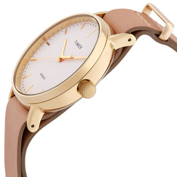 Gold-tone brass case with a brown leather strap. Fixed gold-tone brass bezel. White dial with gold-tone hands and index hour markers. Minute markers around the outer rim. Dial Type: Analog. Quartz movement. Scratch resistant mineral crystal. Pull / push crown. Solid case back. Round case shape. Case size: 37 mm. Case thickness: 8.5 mm. Band width: 18 mm. Tang clasp. Water resistant at 30 meters / 100 feet. Functions: hour, minute, second. Fairfield Series. Luxury watch style. Timex Fairfield Quartz White Dial Ladies Watch TW2P98400.