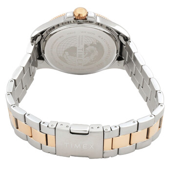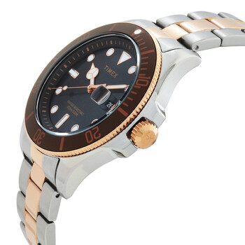 Silver-tone stainless steel case with a two-tone (silver-tone and )rose gold-tone stainless steel bracelet. Brown stainless steel bezel. Black dial with silver-tone hands and dots hour markers. Minute markers around the outer rim. Dial Type: Analog. Date display at the 3 o'clock position. Quartz movement. Scratch resistant mineral crystal. Solid case back. Round case shape, case size: 43 mm. Band width: 20 mm. Fold over clasp with a safety release. Water resistant at 100 meters / 330 feet. Functions: date, hour, minute, second. Harborside Coast Series. Casual watch style. Timex Harborside Coast Quartz Black Dial Men's Watch TW2V42100VQ.