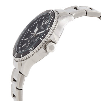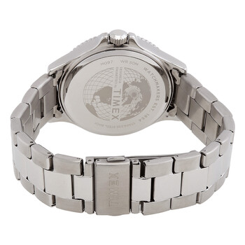 Silver-tone stainless steel case and bracelet. Uni-directional rotating stainless steel bezel with a black ceramic top ring. Black dial with silver-tone hands and index-Arabic numeral hour markers. Minute markers around the outer rim. Arabic numeral marks the 12 o'clock position. Dial Type: Analog. Three sub-dials displaying: day of the week, date and 24 hour. Quartz movement. Scratch resistant mineral crystal. Pull / push crown. Solid case back. Round case shape, case size: 43 mm. Band width: 20 mm. Fold over clasp with a safety release. Water resistant at 50 meters / 165 feet. Functions: date, day, hour, minute, second. Harborside Series. Sport watch style. Timex Harborside Multifunction Quartz Black Dial Men's Watch TW2U13100.