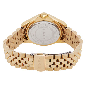 Gold-tone brass case with a gold-tone stainless steel bracelet. Fixed gold-tone brass bezel. Silver dial with gold-tone hands and index hour markers. Minute markers around the outer rim. Dial Type: Analog. Quartz movement. Scratch resistant mineral crystal. Pull / push crown. Solid case back. Round case shape, case size: 38 mm, case thickness: 15 mm. Band width: 20 mm. Water resistant at 50 meters / 165 feet. Functions: hour, minute, second. Kaia Series. Casual watch style. Timex Kaia Quartz Silver Dial Ladies Watch TW2V79800VQ.