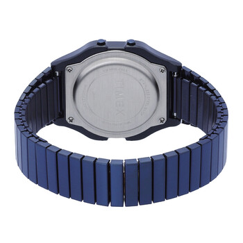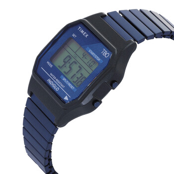 Stainless steel case with a blue stainless steel bracelet. Fixed blue stainless steel bezel. Dial Type: digital. Luminescent indiglo light. Quartz movement. Scratch resistant mineral crystal. Solid case back. Unique case shape, case size: 34 mm, case thickness: 10 mm. Band width: 18 mm. Deployment clasp. Water resistant at 30 meters / 100 feet. Functions: date, day, hour, minute, second, alarm, stopwatch, chronograph. Lab 80 Series. Sport watch style. Timex Lab 80 Alarm Chronograph Quartz Digital Unisex Watch TW2U93800.