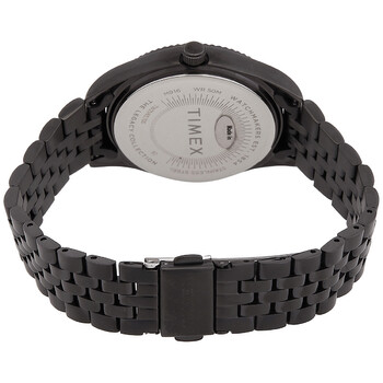 Black stainless steel case and bracelet. Fixed black stainless steel bezel. Black dial with silver-tone hands and index hour markers. Minute markers around the outer rim. Dial Type: Analog. Day and date display at the 3 o'clock position. Quartz movement. Scratch resistant mineral crystal. Pull / push crown. Solid case back. Round case shape, case size: 36 mm, case thickness: 10 mm. Band width: 18 mm. Deployment clasp. Water resistant at 50 meters / 165 feet. Functions: date, day, hour, minute, second. Legacy Rainbow Series. Casual watch style. Timex Legacy Rainbow Quartz Black Dial Ladies Watch TW2V61700.