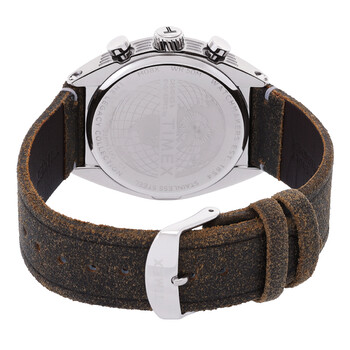 Silver-tone stainless steel case with a brown leather strap. Fixed silver-tone stainless steel bezel. Silver dial with silver-tone hands and index hour markers. Minute markers around the outer rim. Dial Type: Analog. Luminescent hands and markers. Date display at the 3 o'clock position. Chronograph - three sub-dials displaying: 60 second, 60 minute and 12 hour. Quartz movement. Scratch resistant mineral crystal. Pull / push crown. Solid case back. Tonneau case shape, case size: 42 mm, case thickness: 11 mm. Band width: 22 mm. Buckle clasp. Water resistant at 50 meters / 165 feet. Functions: chronograph, date, hour, minute, second. Legacy Series. Sport watch style. Item Variations: TW2W50100VQ. Timex Legacy Tonneau Chronograph Quartz Silver Dial Men's Watch TW2W50100.