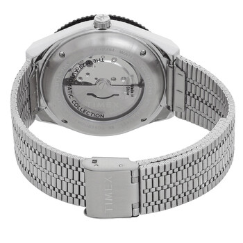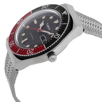 Silver-tone stainless steel case and bracelet. Silver-tone stainless steel with a black and red aluminum top ring bezel. Black dial with silver-tone hands and index hour markers. Minute markers around the outer rim. Dial Type: Analog. Luminescent hands and markers. Day of the week and date display at the 3 o'clock position. Automatic movement. Scratch resistant mineral crystal. Pull / push crown. Transparent see through case back. Round case shape, case size: 40 mm, case thickness: 14.5 mm. Band width: 18 mm. Self-adjustable clasp. Water resistant at 50 meters / 165 feet. Functions: date, day, hour, minute, second. M79 Series. Sport watch style. Timex M79 Automatic Black Dial Men's Watch TW2U83400.