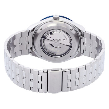 Silver-tone stainless steel case and bracelet. Uni-directional rotating black and blue stainless steel bezel. Blue dial with silver-tone hands and index hour markers. Minute markers around the outer rim. Dial Type: Analog. Luminescent hands and markers. Day of the week and date display at the 3 o'clock position. Automatic movement. Scratch resistant acrylic crystal. Pull / push crown. Transparent case back. Round case shape, case size: 40 mm, case thickness: 14.5 mm. Band width: 18 mm. Deployment clasp. Water resistant at 50 meters / 165 feet. Functions: date, day, hour, minute, second. M79 Series. Sport watch style. Watch label: Japan Movt. Item Variations: TW2V25100VQ. Timex M79 Automatic Blue Dial Men's Watch TW2V25100.