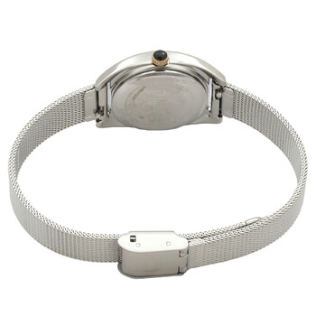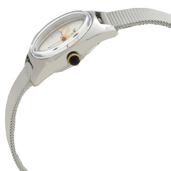 Silver-tone brass case with a silver-tone stainless steel mesh bracelet. Fixed silver-tone brass bezel. Silver-tone dial with gold-tone hands and index hour markers. Dial Type: Analog. Quartz movement. Pull / push crown. Solid case back. Round case shape, case size: 24 mm. Fold over clasp. Water resistant at 30 meters / 100 feet. Functions: hour, minute. Milano Petite Series. Dress watch style. Timex Milano Petite Quartz Silver Dial Ladies Watch TW2T37700.