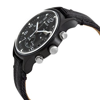 Black-plated stainless steel case with a black fabric strap. Fixed black-plated bezel. Black dial with luminous silver-tone hands and Arabic numeral hour markers. Minute markers around the outer rim. Dial Type: Analog. Luminescent hands and markers. Date display at the o'clock position. Chronograph - three sub-dials displaying: 60 second, 30 minute and 1/10th of a second. Quartz movement. Scratch resistant mineral crystal. Pull / push crown. Solid case back. Round case shape. Case size: 42 mm. Case thickness: 12.5 mm. Band width: 20 mm. Tang clasp. Water resistant at 30 meters / 100 feet. Functions: chronograph, date, hour, minute, second. MK1 Series. Casual watch style. Timex MK1 Chronograph Quartz Black Dial Men's Watch TW2R68700.