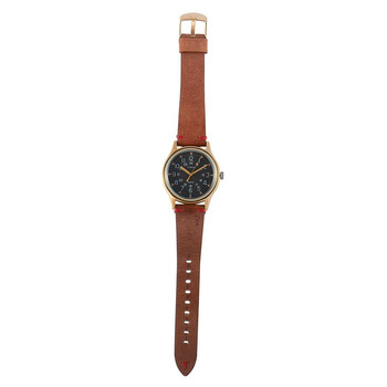 Bronze-tone stainless steel case with a brown leather strap. Fixed bronze-tone bezel. Black dial with luminoius bronze-tone hands and Arabic numeral hour markers. 24 hour markers. Minute markers around the outer rim. Dial Type: Analog. Luminescent hands and markers. Quartz movement. Scratch resistant mineral crystal. Pull / push crown. Solid case back. Round case shape. Case size: 40 mm. Case thickness: 11 mm. Band width: 20 mm. Tang clasp. Water resistant at 30 meters / 100 feet. Functions: hour, minute, second, military. MK1 Series. Luxury watch style. Timex MK1 Quartz Black Dial Men's Watch TW2R96700.