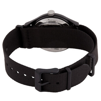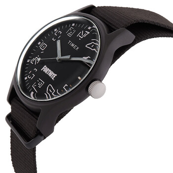 Black aluminum case with a black fabric strap. Fixed black aluminum bezel. Black dial with silver-tone hands. Minute markers around the outer rim. Dial Type: Analog. Quartz movement. Scratch resistant acrylic crystal. Pull / push crown. Solid case back. Round case shape, case size: 40 mm, case thickness: 12 mm. Band width: 20 mm. Buckle clasp. Water resistant at 50 meters / 165 feet. Functions: hour, minute, second. MK1 X Fortnite Series. Casual watch style. Item Variations: TW2W97000JR. Timex MK1 X Fortnite Quartz Black Dial Men's Watch TW2W97000.