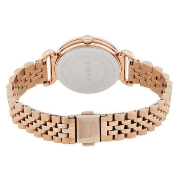 Rose gold-tone stainless steel case and bracelet. Pink / rosegold dial with rose gold-tone hands and Arabic numeral hour markers. Minute markers around the outer rim. Dial Type: Analog. Luminescent hands. One subdial displaying: small second. Quartz movement. Scratch resistant mineral crystal. Pull / push crown. Solid case back. Round case shape, case size: 33 mm. Deployment with push button release clasp. Water resistant at 50 meters / 165 feet. Functions: hour, minute, second. Casual watch style. Timex Model 23 Quartz Ladies Watch TW2T88500.