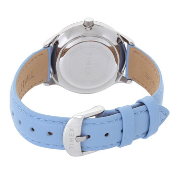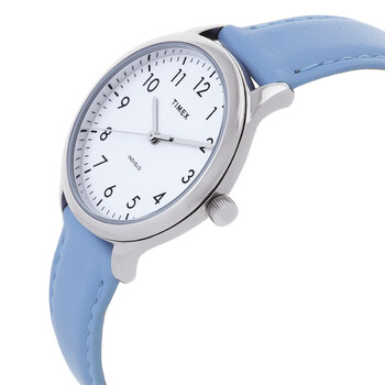 Silver-tone brass case with a blue leather strap. Fixed silver-tone brass bezel. White dial with silver-tone hands and Arabic numeral hour markers. Minute markers around the outer rim. Dial Type: Analog. Luminescent indiglo light up watch dial. Quartz movement. Scratch resistant mineral crystal. Pull / push crown. Solid case back. Round case shape, case size: 32 mm, case thickness: 16. Buckle clasp. Water resistant at 50 meters / 165 feet. Functions: hour, minute, second. Additional Info: indiglo light up watch dial. Modern Easy Reader Series. Casual watch style. Timex Modern Easy Reader Quartz White Dial Ladies Watch TW2V25300.