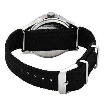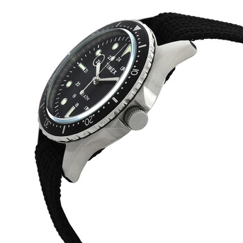 Silver-tone stainless steel case with a black fabric strap. Uni-directional rotating black stainless steel bezel. Black dial with silver-tone hands and dots hour markers. Minute markers around the outer rim. Dial Type: Analog. Luminescent hands and markers. Quartz movement. Scratch resistant mineral crystal. Pull / push crown. Solid case back. Round case shape, case size: 41 mm. Buckle clasp. Water resistant at 100 meters / 330 feet. Functions: hour, minute, second. Navi Series. Sport watch style. Timex Navi Quartz Black Dial Men's Watch TW2T75600.
