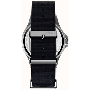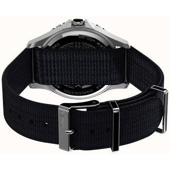 Silver-tone stainless steel case with a blue fabric strap. Uni-directional rotating blue stainless steel bezel. Blue dial with silver-tone hands and index hour markers. Minute markers around the outer rim. Dial Type: Analog. Luminescent hands and markers. Quartz movement. Scratch resistant mineral crystal. Solid case back. Round case shape, case size: 41 mm. Tang clasp. Water resistant at 100 meters / 330 feet. Functions: hour, minute, second. Casual watch style. Timex Navi Xl Quartz Blue Dial Men's Watch TW2T75400.