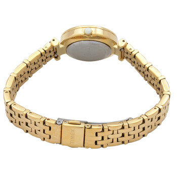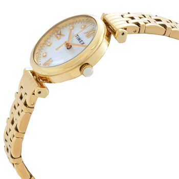 Gold-tone stainless steel case and bracelet. Fixed gold-tone stainless steel bezel. Mother of pearl dial with gold-tone hands and Roman numeral-crystal hour markers. Minute markers around the outer rim. Dial Type: Analog. Quartz movement. Scratch resistant mineral crystal. Pull / push crown. Solid case back. Round case shape, case size: 28 mm. Deployment clasp. Water resistant at 30 meters / 100 feet. Functions: hour, minute, second. Parisienne Series. Dress watch style. Timex Parisienne Quartz Crystal Mother of Pearl Dial Ladies Watch TW2T78900.