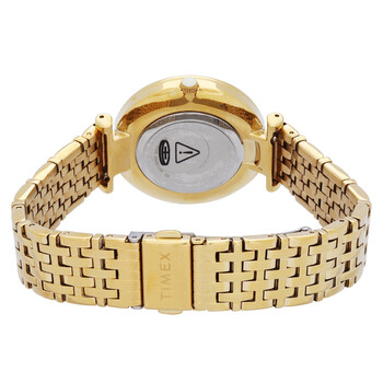 Gold-tone stainless steel case and bracelet. Fixed gold-tone stainless steel bezel. Mother of pearl dial with gold-tone hands and index-Roman numeral hour markers. Minute markers around the outer rim. Dial Type: Analog. Quartz movement. Scratch resistant mineral crystal. Pull / push crown. Solid case back. Round case shape, case size: 35 mm, case thickness: 9 mm. Band width: 16 mm. Fold over clasp with a safety release. Water resistant at 50 meters / 165 feet. Functions: hour, minute, second. Parisienne Series. Casual watch style. Timex Parisienne Quartz Mother of Pearl Dial Ladies Watch TW2T79100VQ.