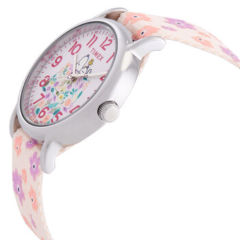 Silver-tone brass and llb case with a multicolor fabric strap. Fixed silver-tone bezel. White floral dial with grey-tone hands and Arabic numeral hour markers. Minute scale around the inner rim. Dial Type: Analog. Scratch resistant sapphire crystal. Solid case back. Round case shape, case size: 38 mm, case thickness: 7.5 mm. Band width: 20 mm. Buckle clasp. Water resistant at 30 meters / 100 feet. Functions: hour, minute, second. Peanuts Series. Dress watch style. Item Variations: TW2W33200JT. Timex Peanuts Ladies Watch TW2W33200.