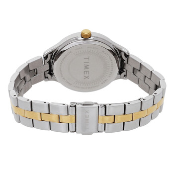 Silver-tone brass case with a two-tone (silver-tone and gold-tone) brass bracelet. Fixed silver-tone brass bezel. Silver-tone dial with gold-tone hands and stars hour markers. Dial Type: Analog. Quartz movement. Scratch resistant mineral crystal. Solid case back. Round case shape, case size: 36 mm, case thickness: 10 mm. Band width: 19 mm. Deployment with push button release clasp. Water resistant at 30 meters / 100 feet. Functions: hour, minute. Peyton Series. Dress watch style. Timex Peyton Quartz Silver Dial Ladies Watch TW2V23500.