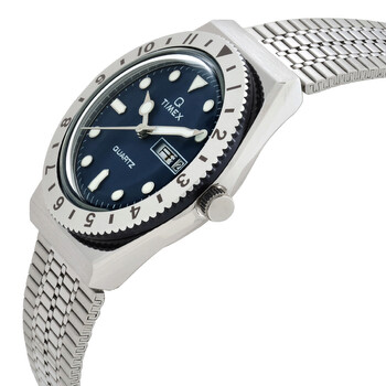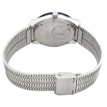 Silver-tone stainless steel case and bracelet. Fixed silver-tone stainless steel bezel. Blue dial with silver-tone hands and index hour markers. Hour markers around the outer rim. Dial Type: Analog. Luminescent hands and markers. Day of the week and date display at the 3 o'clock position. Quartz movement. Scratch resistant acrylic crystal. Pull / push crown. Solid case back. Round case shape, case size: 36 mm, case thickness: 12 mm. Band width: 16 mm. Fold over clasp. Water resistant at 50 meters / 165 feet. Functions: date, day, hour, minute, second. Q Timex Series. Casual watch style. Timex Q Quartz Blue Dial Ladies Watch TW2U95500VQ.