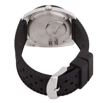 Silver-tone stainless steel case with a black synthetic rubber strap. Uni-directional rotating black aluminum bezel. Black dial with silver-tone hands and index hour markers. Minute markers around the outer rim. Dial Type: Analog. Date display at the 3 o'clock position. Quartz movement. Scratch resistant acrylic crystal. Pull / push crown. Solid case back. Round case shape, case size: 36 mm, case thickness: 9.5 mm. Band width: 20 mm. Buckle clasp. Water resistant at 50 meters / 165 feet. Functions: date, hour, minute, second. Q Timex Series. Sport watch style. Item Variations: TW2W22400ZV. Timex Q Reissue 1971 Quartz Black Dial Men's Watch TW2W22400.